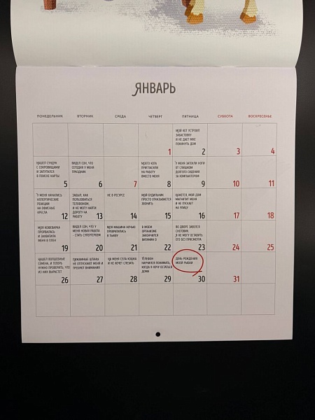 «365 поводов, чтобы забить на работу» — настенный календарь для тех, кто умеет отдыхать с фантазией. Ежедневно вас будет приветствовать новая отговорка, а на заставке каждого месяца — животное-наставник, мастер отдыха и душевного баланса. Легкий, ироничный и обаятельный, этот календарь напомнит: иногда лучший план — ничего не планировать. Пусть в вашей жизни будет больше поводов просто быть — а не только работать.