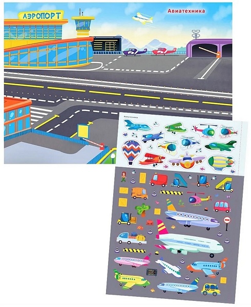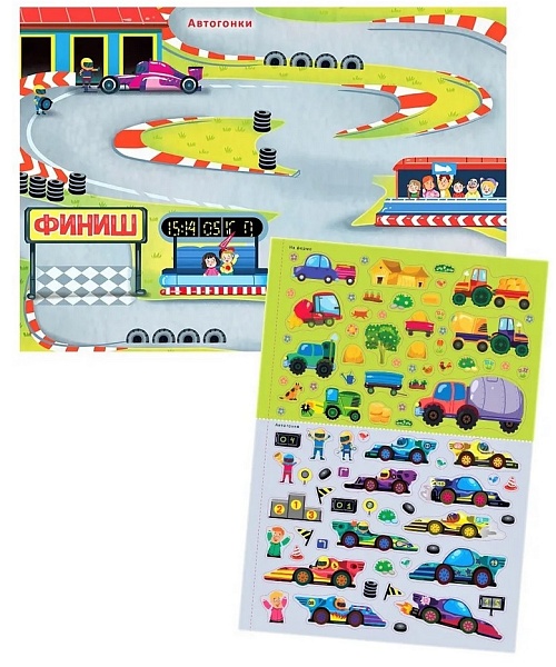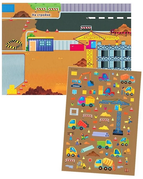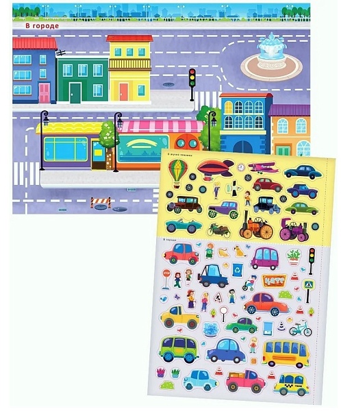 Более 600 ярких наклеек, которые помогут ребёнку создавать собственные картины и познакомят ребёнка с разными видами транспорта и другой техники