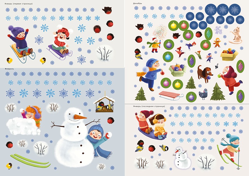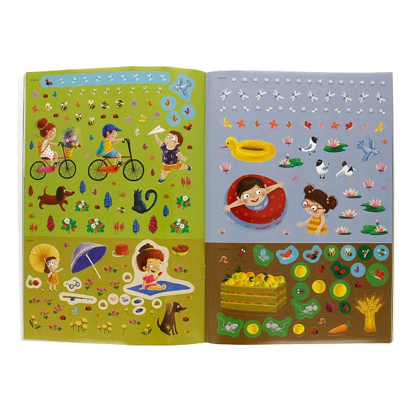 В ней вы найдёте 12 ярких тематических фонов каждого календарного месяца: январь, февраль, март, апрель и т.д., более 600 красочных наклеек, которые помогут ребёнку создавать собственные картины и познакомят с четырьмя сезонами: зима, весна, лето и осень, а также 12 стихов о временах года для развития речи и кругозора.