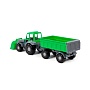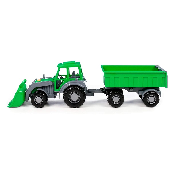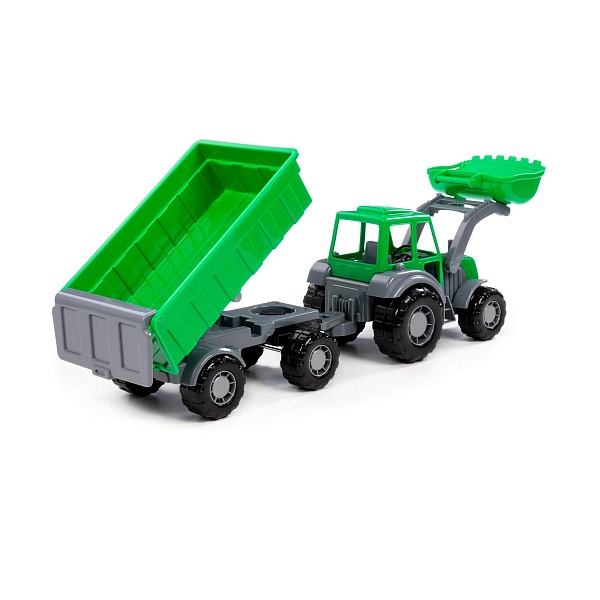 Ребенок может играть трактором как самостоятельной игрушкой или дополнить функциональным трейлером, необходимым во время перевозки грузов и материалов. Передний ковш поднимается и фиксируется, кузов прицепа также поднимается, задний борт откидывается.
