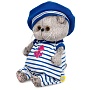 Малыш Басик в трогательном комбинезончике в морском стиле, сшитом из х/б трикотажа в сине‑белую полоску и с отделкой синим кантом. Спереди комбинезон украшен нашивкой в виде якоря. На голове у Басика мягкий берет морского синего цвета с отделкой тесьмой и маленьким розовым помпоном сверху.