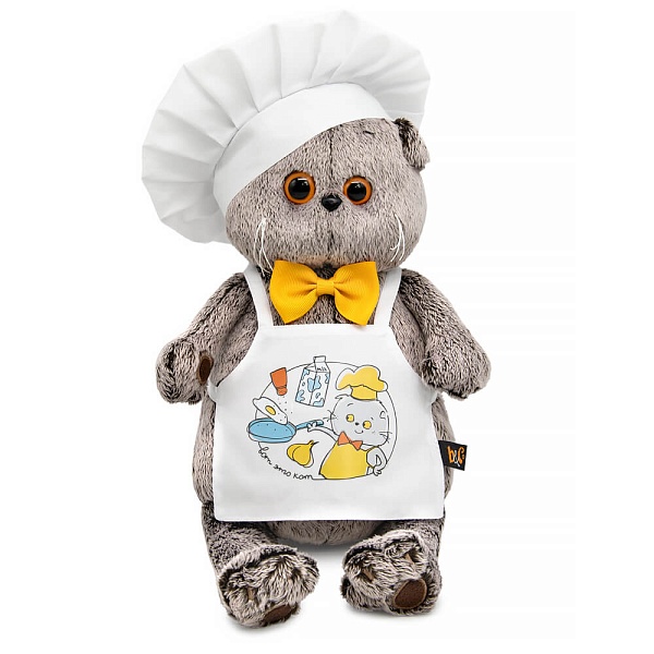 Милейшая игрушка Басик от популярного бренда Budi Basa - это идеальный подарок как ребенку, так и взрослому. Приятный на ощупь материал и невероятно милый внешний вид не оставят равнодушным ни одного человека! Басик снова в образе шеф-повара. На коте фирменный белый фартук с авторским принтом, объёмный поварской колпак из плотного белоснежного хлопка и неизменный галстук-бабочка.