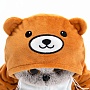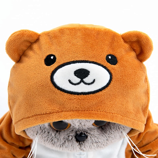 Кот Басик в милом кигуруми «Медвежонок». Кигуруми сшито из нежного софта карамельного цвета со вставкой из молочного софта. На капюшоне аппликация с вышивкой в виде мордочки медвежонка. Низ рукавов и штанишек на резиночках, спереди кигуруми застёгивается на зип-молнию. На шее у Басика его любимый галстук-бабочка.