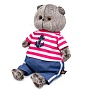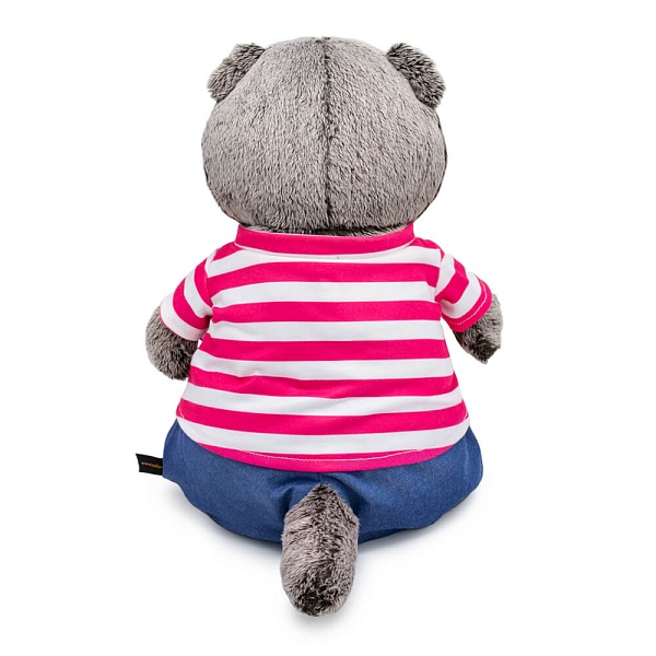 Кот Басик в трикотажной футболке в розово‑белую полоску с нашивкой спереди в виде якоря. Также на Басике модные синие штаны с белыми лампасами.