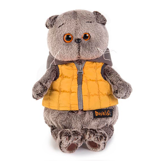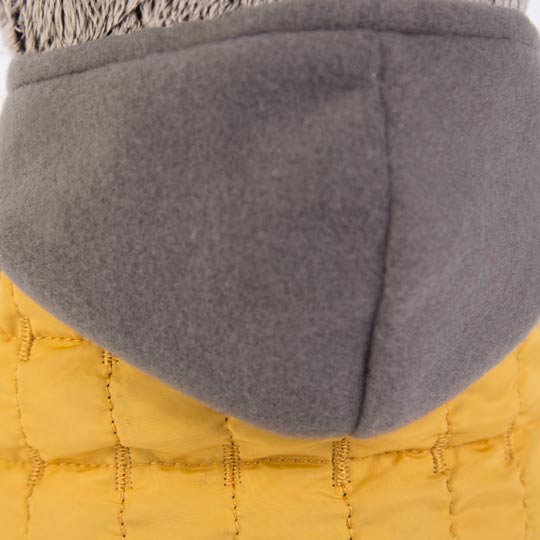 Кот в оригинальном жилете цвета охры из стёганной плащёвки с серой отделкой по рукаву. Жилет сшит с флисовым капюшоном цвета муссон и серой тракторной молнией спереди.