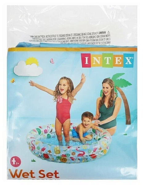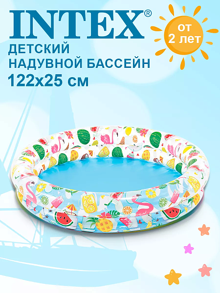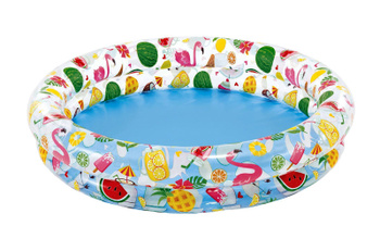 Надувной бассейн с узором из фруктов для детей от 2 лет. Благодаря низким бортикам ребенок может сам забираться в воду. Модель изготовлена из прочного и мягкого винила. Размеры: 122х25см.