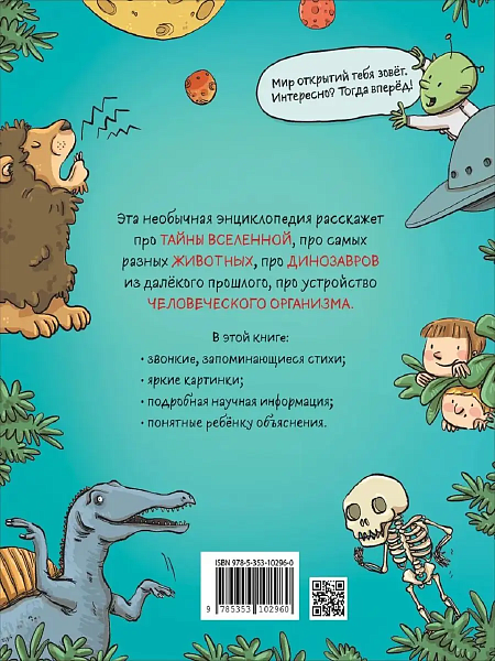 Эта необычная энциклопедия станет любимой книгой всех маленьких читателей! Ведь про тайны Вселенной, про самых разных животных, населяющих нашу планету, про динозавров из далекого прошлого, про устройство человеческого организма она рассказывает звонкими, запоминающимися стихами! Издание сочетает яркие детализированные иллюстрации, интересные научные факты, подробные описания и объяснения, адаптированные к пониманию малышей.