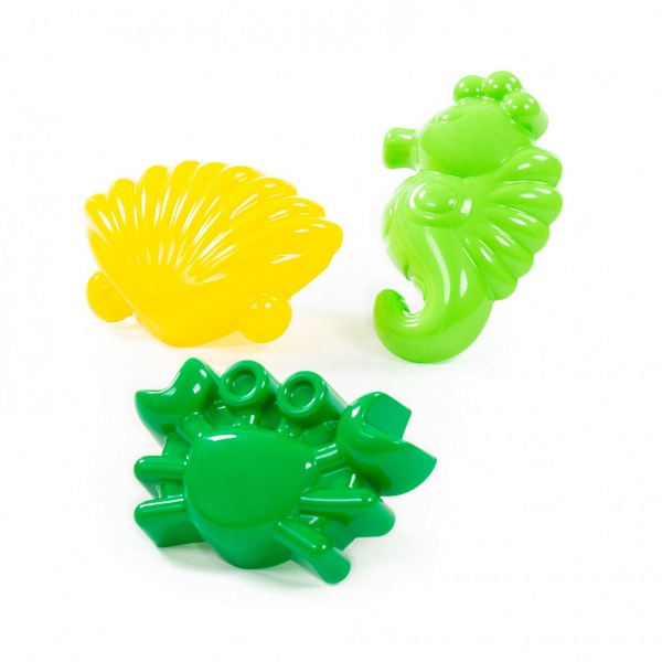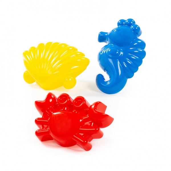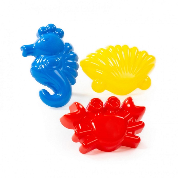 Формочки в виде подводных обитателей (краб, морской конёк, ракушка) 36551 от компании Полесье для игр в песочнице малышам от 2 лет.