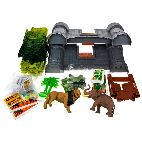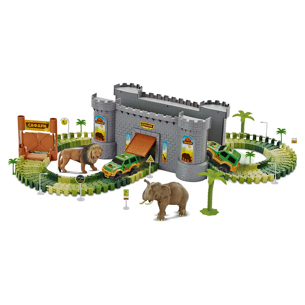 В набор "Сафари" входит машинка, замок с подъемными воротами, ворота, 2 фигурки животных, трасса - всего 119 деталей.