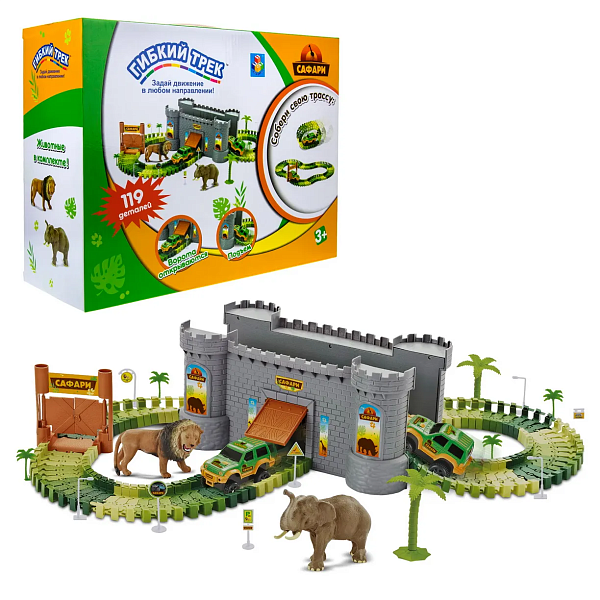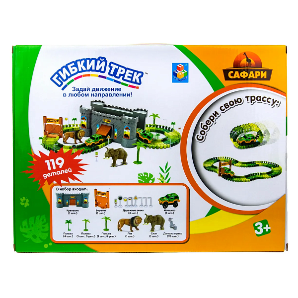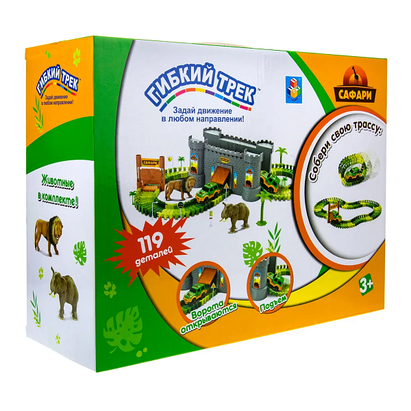 Игровой набор гибкий трек Сафари 119дет 1toy Т20864. Наборы серии "Гибкий трек" задают новый тренд традиционной игре с машинками. Дорогу можно не просто собрать так, чтобы она поворачивала и петляла в разные стороны (благодаря специальным деталям-рельсам), но также сделать выпуклой или вогнутой или вообще "закольцевать", заставив машинку ехать внутри нее, словно хомячка внутри специального круга.