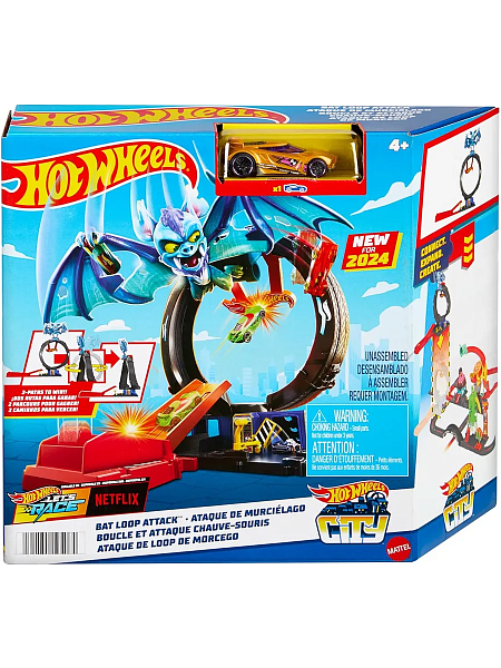 Соревнуйтесь и выполняйте трюки, чтобы победить летучую мышь, которая напала на шиномонтаж Hot Wheels City.