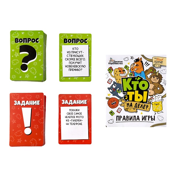 Настольная игра для детей «Кто ты на деле?» - это вариант игры для детей старше 14 лет. Узнайте, как вас видят друзья? Берите карточки с вопросами и заданиями и смейтесь над собственными и чужими шутками и выходками!