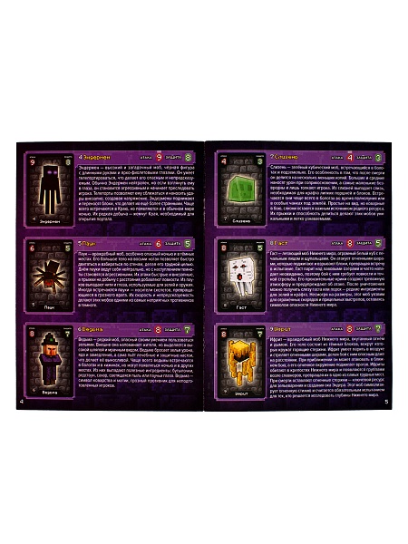 Каждый игрок в закрытую получает 10 карточек мобов. Первый раунд проходит по параметру "Атака" или "Защита" согласно договоренности участников. Игроки одновременно выкладывают перед собой по одной карте рубашкой вверх, а затем вместе открывают их. Мобы сравниваются по избранному значению, тот чей персонаж сильнее, забирает открытые карты других игроков. Игра продолжается, пока на руках есть карты. Попробуй собрать больше всего победных карточек.