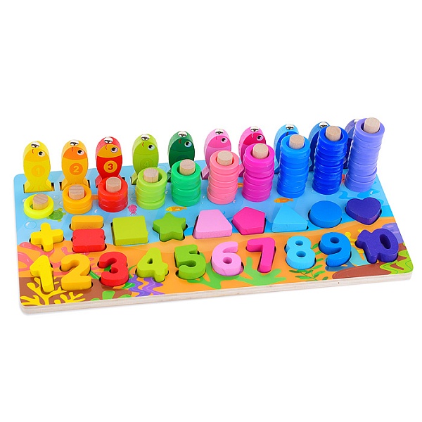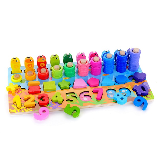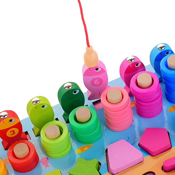 Этот многофункциональный набор сочетает в себе 5 развивающих активностей в одной компактной деревянной доске! Ребёнок сможет изучать цифры, формы и цвета, собирать пирамидки, осваивать счёт и ловить магнитных рыбок. Игра идеально подходит для комплексного развития ключевых навыков в увлекательной игровой форме.
