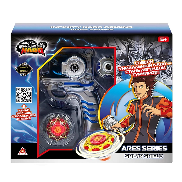 Металлический волчок Infinity Nado Solar shield Гербовый щит принадлежит Аресу Солнца и состоит из пяти частей: аватара Nado, верхнего кольца, двойного атакующего кольца, оси и наконечника. Главным его свойством является защита, что позволяет отражать мощные атаки соперников. Кроме того, волчок оснащён 2 усиленными режимами, позволяющими адаптировать тактику в ходе турнира.