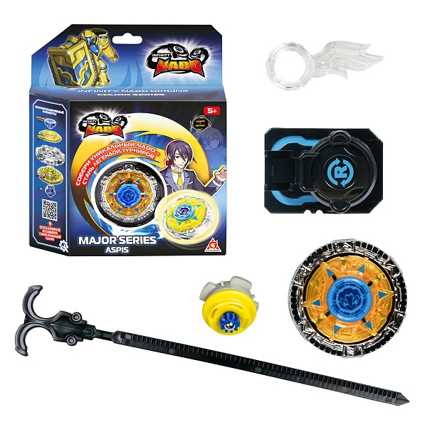 Металлический волчок Infinity Nado Мэйджор Aspis Ослепительный щит состоит из пяти частей: аватара Nado, верхнего и атакующего колец, центральной оси и наконечника. Он принадлежит Дэвису и отличается повышенной защитой, что позволяет отражать мощные атаки соперников.