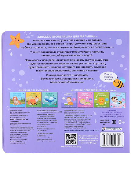«Книжка-проявляшка для малыша» – это яркая книжка-игрушка для купания и не только. Вы можете брать её с собой на прогулку или в путешествие, не боясь испачкать, так как в случае необходимости её легко помыть.