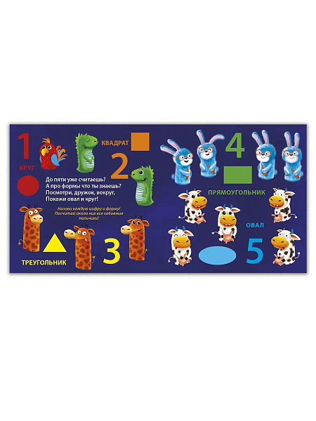 -Книжка-картонка может использоваться как демонстрационное пособие – отлично подойдет для изучения основных цветов и форм, а также первого счета от 1 до 5.