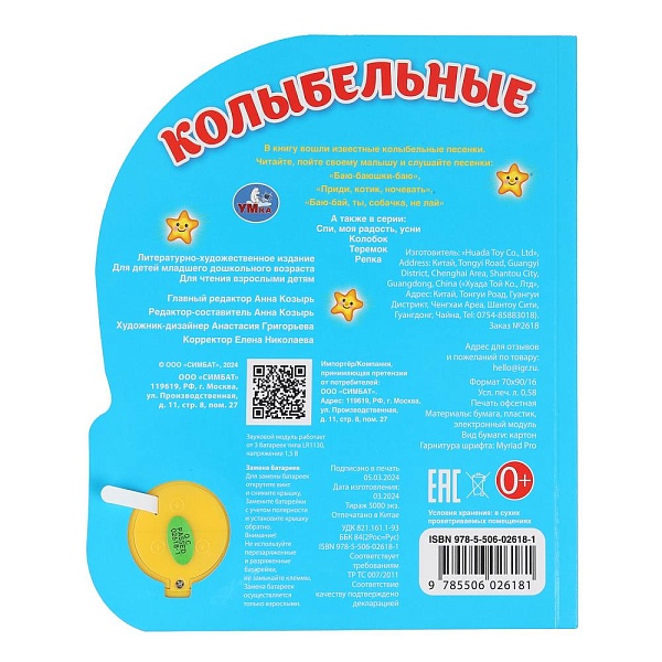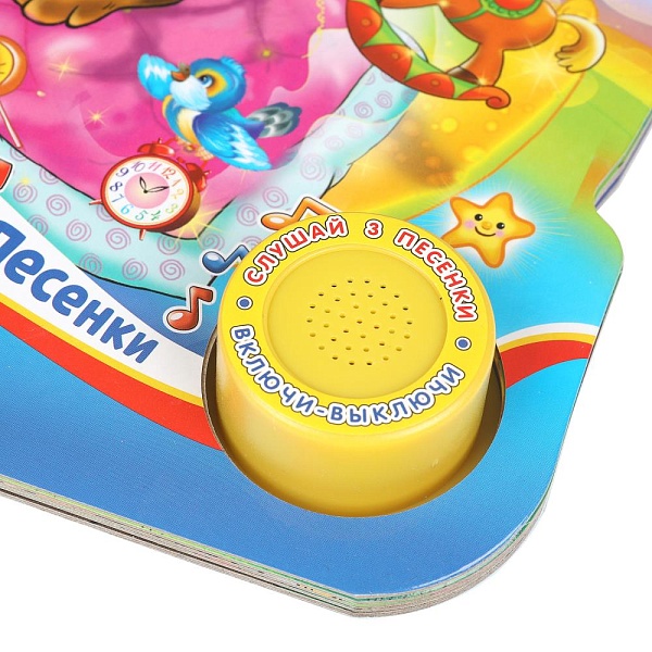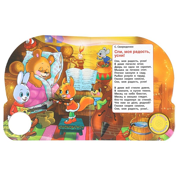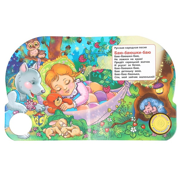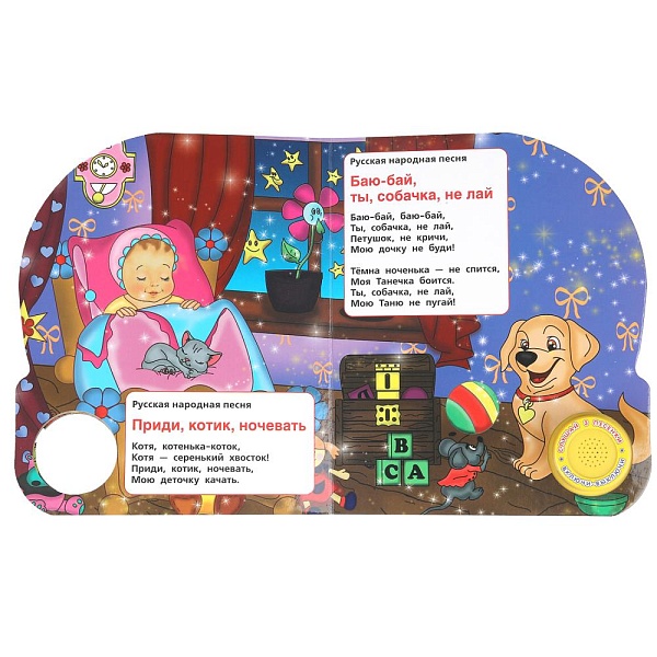 Данная книга поможет ребёнку погрузиться в сладкие сны: мама может включить записанные на звуковую кнопку мелодичные колыбельные или спеть их сама, используя тексты песен из книги. Малыш также сможет сам легко освоить включение звука: по нажатию на кнопку начинает проигрываться песенка, при втором нажатии звук выключится, при третьем нажатии зазвучит следующая композиция и т.д. Благодаря компактному формату книгу удобно взять с собой в дорогу.