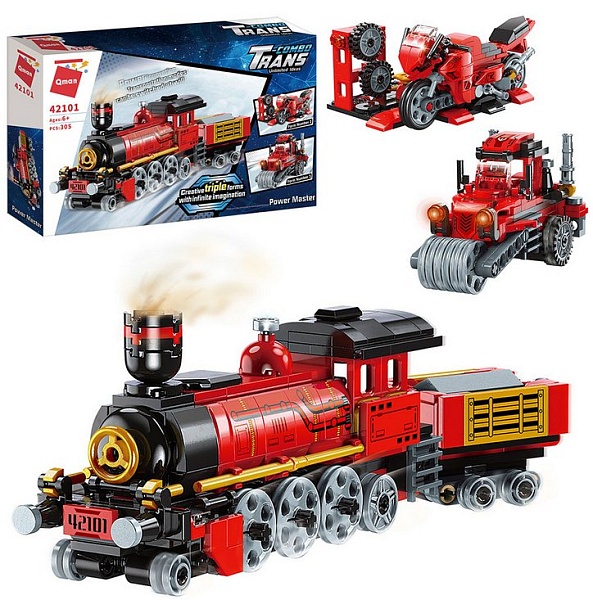 Конструктор-трансформер представляет собой комплекс 3 в 1. Ваш ребенок может собрать поезд с прицепом, каток или мотоцикл с СТО. Во время игры всегда можно собрать другую модель транспортного средства.