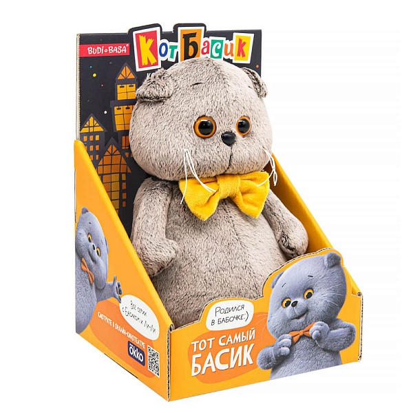 Кот Басик в фирменном галстуке‑бабочке янтарно‑желтого цвета. Аксессуар сшит из мягкого бархатистого софта.