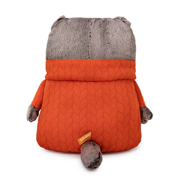 Необычная подушка кот Басик из оригинального меха с вышитой мордочкой. На коте‑подушке вшит интересный свитер с высоким воротником стойка. Оранжевый свитер из плотной мягкой ткани с выработкой под вязку косами. Внизу на подушке пришит фирменный логотип.