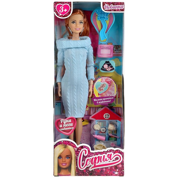 Будущая мама София одета в вязаное платье по фигуре нежно-голубого цвета. Образ куколки дополняют модные крупные серьги. Одежду и аксессуары легко снять и надеть. С такой модной куклой девочке будет интересно и весело играть: благодаря тому, что руки и ноги куклы подвижны, им можно придать любое положение. У Софии длинные красивые волосы, которые хозяйка куклы сможет заплетать в разные причёски. Детально проработанный дизайн игрушки вдохновит девочку на новые игровые сюжеты.