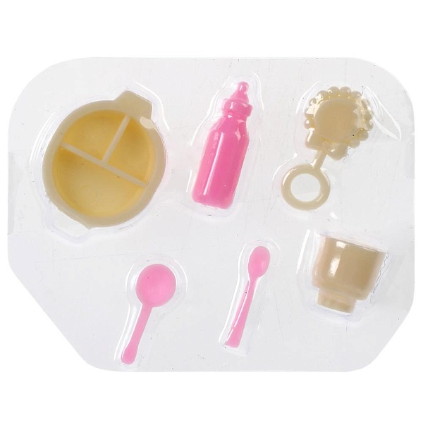 - набор аксессуаров для ухода за малышом: бутылочка, погремушка, тарелка, ложка и др.