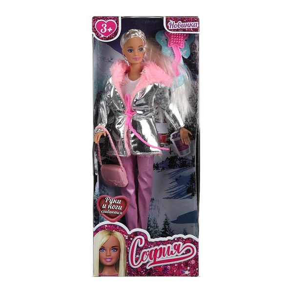 София одета в розовые брюки с белой водолазкой и стильную серебристую парку, отороченную розовым мехом. Образ куколки дополняют красивые серьги и розовая сумочка. Одежду и аксессуары легко снять и надеть. С такой модной куклой девочке будет интересно и весело играть: благодаря тому, что руки и ноги куклы подвижны, им можно придать любое положение. У Софии длинные красивые волосы, собранные в хвост с косичкой, которые хозяйка куклы по желанию может расплести и изменить ей причёску. Детально проработанный дизайн игрушки вдохновит девочку на новые игровые сюжеты.