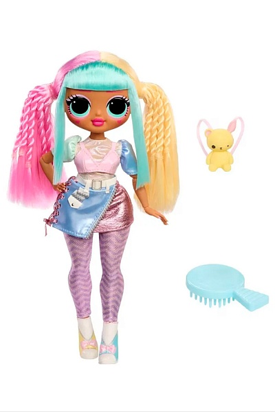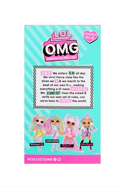 В комплекте ЛОЛ СЮРПРАЙЗ ОМГ Энтри Кэндилишес содержится кукла с длинными густыми прошитыми волосами, подвижными ручками и ножками, сумочка, пара обуви, расческа для куклы, подставка.