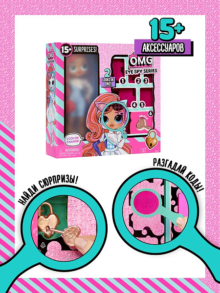 В комплекте ЛОЛ СЮРПРАЙЗ ОМГ Шпионы Джессика Спай содержится кукла с длинными густыми прошитыми волосами, подвижными ручками и ножками, комплект одежды, обувь, модные аксессуары, секретное сообщение, лупа, расческа для куклы, подставка. Кукла меняет цвет в холодной воде (рекомендуем добавить в воду кубики льда). Игрушка изготовлена из полимерных материалов с элементами из текстиля. Товар сертифицирован и безопасен для детского использования. Упаковка: коробка с окном 25,5 х 8 х 25,5 см.