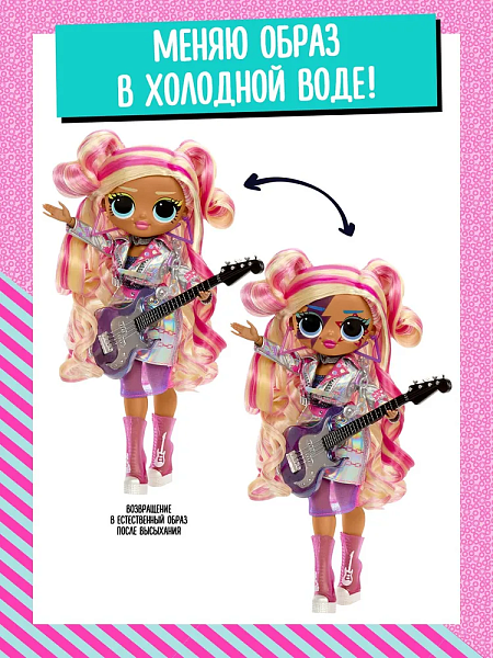С эффектной гитарой в руках и длинными волосами в розово-золотых тонах Джордан покорила не одну сцену. А необычные ботильоны подчеркивают динамичный характер. Каждая нота — признание в любви к свободе и творчеству. Она умеет быть центром внимания, заряжает энергией и поднимает настроение всей команде. Настоящая звезда вечеринки! Ее макияж меняется в холодной воде прямо на глазах!