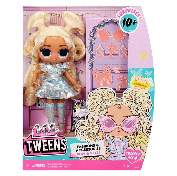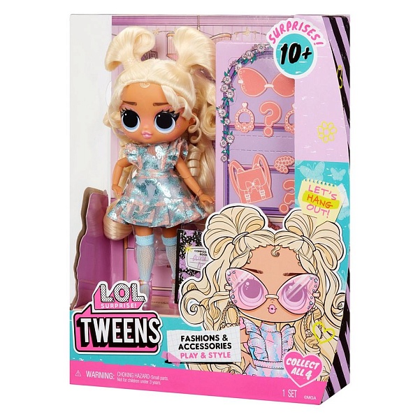 В игровом наборе ЛОЛ СЮРПРАЙЗ Tweens модная кукла 25 см с длинными густыми прошитыми волосами, подвижными ручками и ножками (9 точек артикуляции), комплект одежды и обуви, модные и тематические аксессуары, расческа и подставка для куклы. Игрушка изготовлена из полимерных материалов с элементами из текстиля и бумаги. Товар сертифицирован и безопасен для детского использования. Упаковка: коробка с окном 20,5х8х26 см.