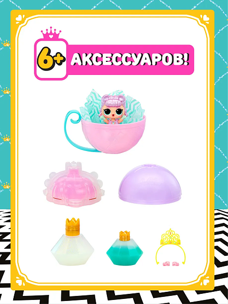В игровой набор ЛОЛ CЮРПРАЙЗ Кукла в шаре Принцессы входят мини-кукла, предмет одежды, аксессуар, 2 бутылочки с гелем и форма для создания юбки, шар-контейнер и ручка для шара-контейнера.