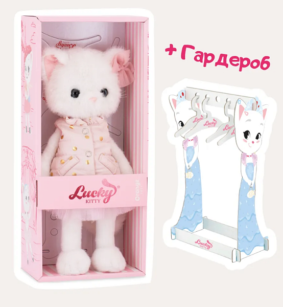 Коллекция мягких игрушек Lucky Kitty — это стильные кошечки в подарочной коробке. Lucky Kitty — настоящие друзья тем, кто обожает котиков. Высота игрушки — 37 см. Внутри прочный каркас, благодаря которому она легко принимает различные позы. Одежда у Lucky Kitty модная и продуманная до мелочей. Кстати, все наряды совместимы с коллекцией собачек Lucky Doggy. А это значит, что у вашей кошечки всегда будет новый образ и возможность для сочетания одежды из разных наборов. Каждая кошечка упакована в коробку нежно-розового цвета, внутри которой вас ожидает подарок - гардероб и плечики, на которые удобно вешать наряды. Особое очарование игрушке придают глазки невероятной глубины, словно они настоящие. Невероятно мягкий мех, который хочется гладить. Lucky Kitty созданы дарить яркие эмоции, это подарок, который запомнится!