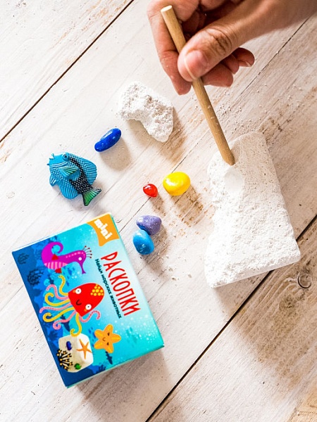 В наборе: брусок с артефактами внутри (игрушка из пластика в форме морского животного и россыпь цветных камней), деревянный стек для дробления.