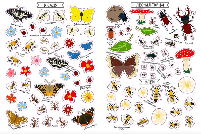 С помощью 13 тематических фонов и более 300 ярких наклеек ребёнок сможет узнать, где обитают насекомые и как они называются. Бабочки, кузнечики, гусеницы, жучки поселятся у пруда, в лесу, на лугу и в саду.