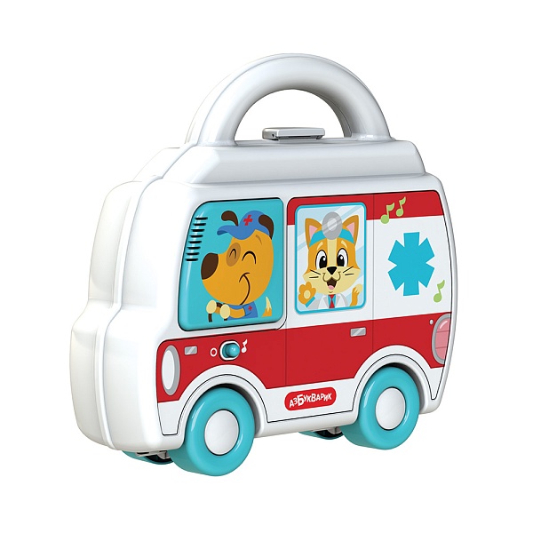 В этом большом подарочном наборе есть все, что нужно для игры в доктора! Малыш сможет катать музыкальную машину скорой помощи, слушать познавательные песенки и советы доктора в стихах. Машинка также является чемоданчиком, в котором ребенок найдет инструменты доктора: стетоскоп со звуками и огоньками, термометр с подвижной шкалой, шприц и очки. У машинки-чемоданчика есть ручка, малышу будет удобно носить его с собой!