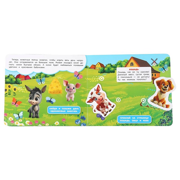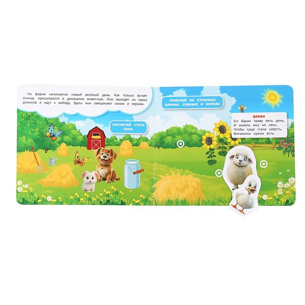 Книга с липучками поможет малышу провести время с пользой, развить фантазию и воспитать усидчивость. Ребёнок познакомится с обитателями фермы, научится придумывать сюжетные рассказы, выделять один объект из множества других и находить для него место на странице этого удивительного издания. Оригинальный крепёж элементов на липучках делает игру занимательнее и интереснее. Получение информации в такой игровой форме позволит быстрее и эффективнее усвоить новые знания, а также потренировать мелкую моторику.