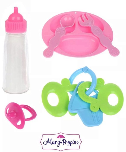 6 предметов: 1 бутылочка (3,5х3,5х12 см), 1 тарелка (12х9 см), 1 соска-пустышка (5х3 см), 1 погремушка, 1 вилка, 1 ложка