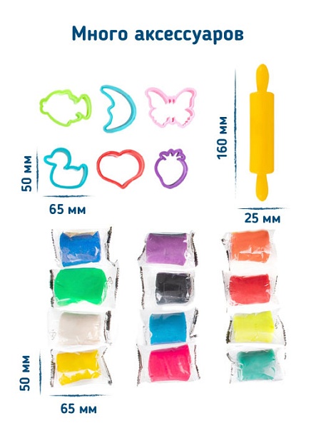 При помощи инструментов и аксессуаров, входящих в комплект набора, ваш ребенок сможет слепить из цветного теста любые фигурки и украсить их.