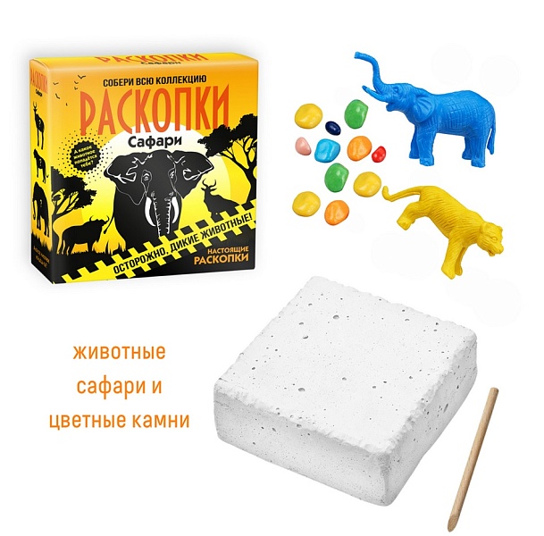 В бруске из набора для раскопок «Сафари» спрятаны разные дикие животные. Достаньте прочный стек и попробуйте отыскать находки: снимайте слои гипса, пока не найдёте опасного аллигатора, весёлую зебру или других зверей. Вам также будут попадаться необычные камни – они наверняка очень древние!