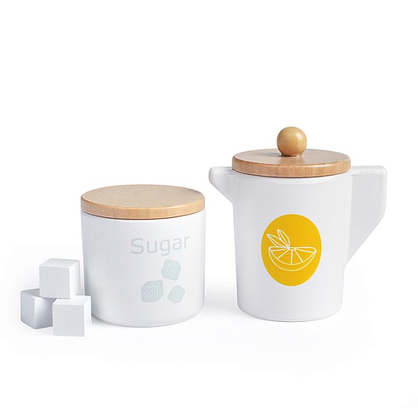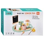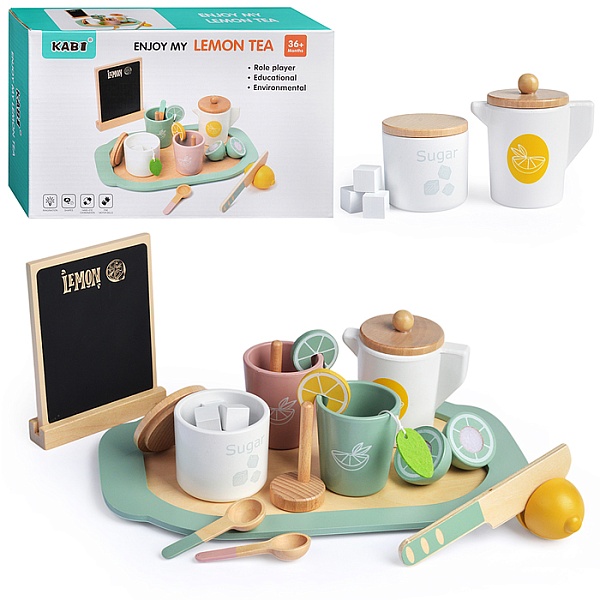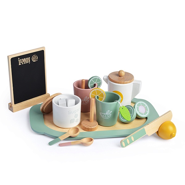 В комплекте: поднос, чайник, две чашки, две ложки, ножик, три кусочка сахара, мята и лимон.
