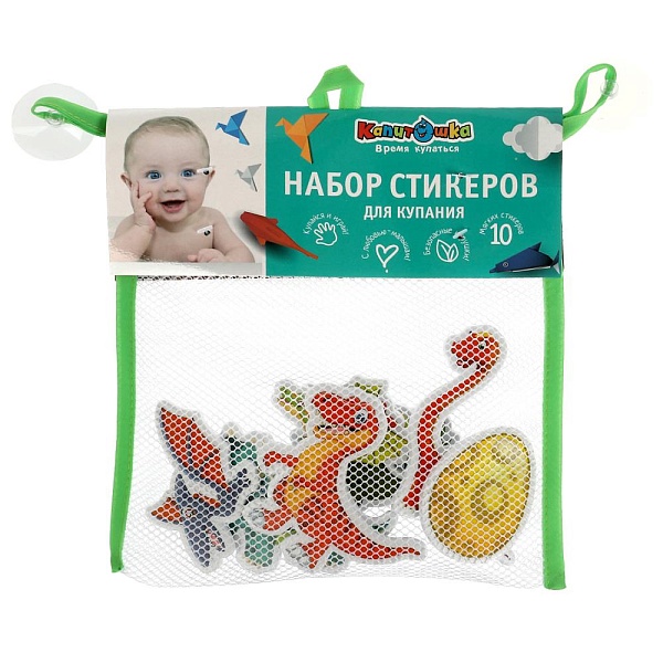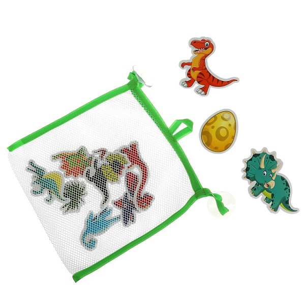 Забавные динозавры красочной расцветки привлекут внимание и поднимут настроение малышу. Фигурки можно запускать в плавание, расставлять на краю ванны или, намочив их водой, крепить на плитку, придумывая истории и сценки. Ребёнок не захочет расставаться с яркими интересными игрушками и завершать водные процедуры. Больше никаких слёз во время купания! Набор находится в сумочке-сетке на которой имеются присоски и петелька для удобного крепления в ванной.