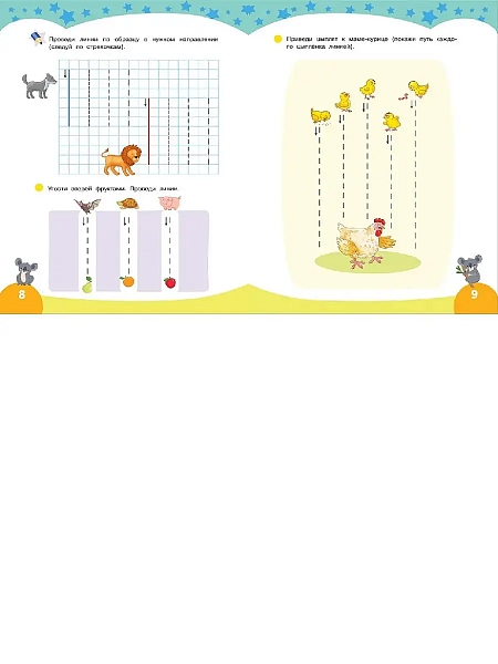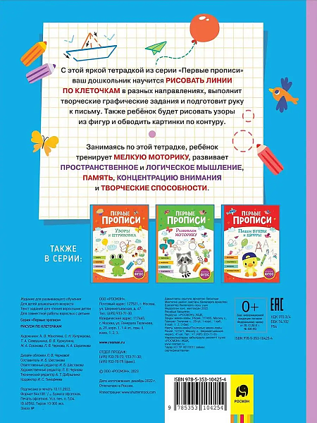 С этой яркой тетрадкой из серии «Первые прописи» ваш дошкольник научится РИСОВАТЬ ЛИНИИ ПО КЛЕТОЧКАМ в разных направлениях, выполнит творческие графические задания и подготовит руку к письму. Также ребёнок будет рисовать узоры из фигур и обводить картинки по контуру.
