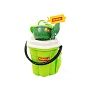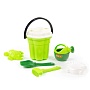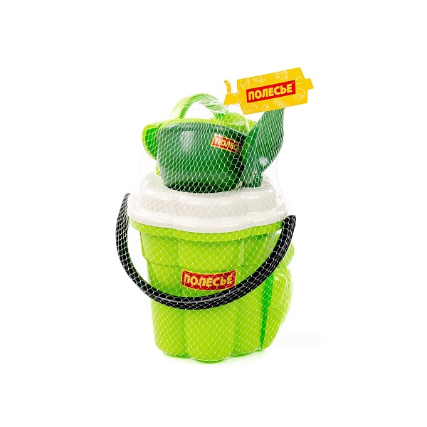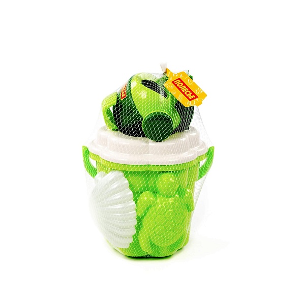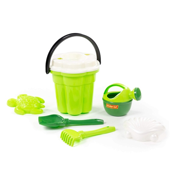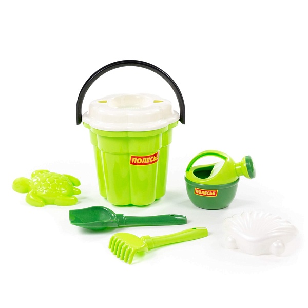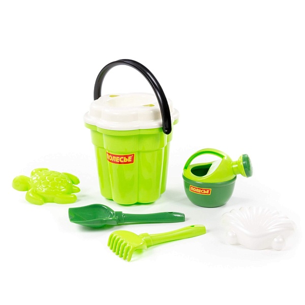 Он включает в себя большое ведро с ситечком, лопатку, грабельки, 2 формочки (черепашка и ракушка) и маленькую лейку.