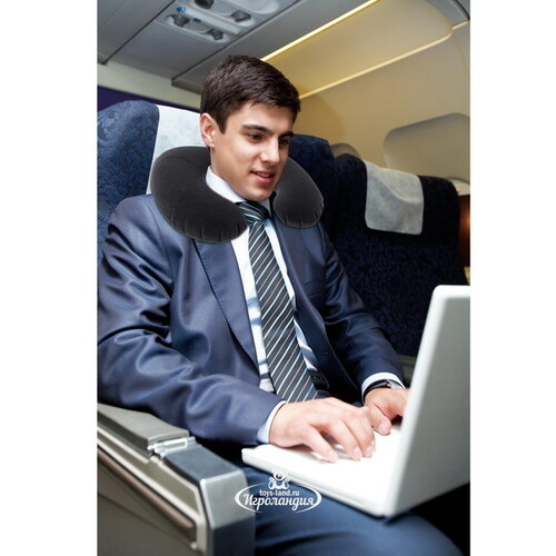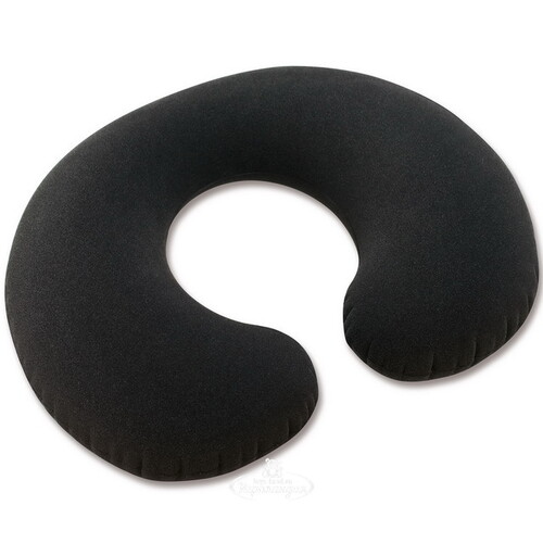 Удобная подушка не маркого темно-серого цвета изготовлена из прочного водонепроницаемого винила, сверху покрыта флокированным слоем, напоминающим велюр. Подушка обеспечивает правильное положение головы во время сна при длительных поездках и перелетах.