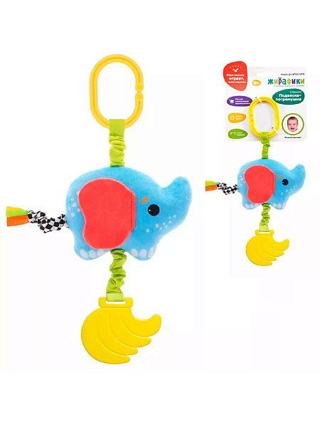 Подвеска погремушка Слоник Жирафики 940030. Этот очаровательный слоник станет одной из первых и самых любимых игрушек малыша. Такие игрушки развивают у детей мелкую моторику рук, зрение, слух и способность концентрировать внимание. А еще с ними так весело играть! Внутри слоника - погремушка, которая будет забавно греметь, если потрясти игрушкой в воздухе. На животике висит фактурный прорезыватель в форме грозди бананов, который поможет ребёнку справиться с неприятными ощущениями при прорезывании зубов. У слоненка шуршащие ушки и разноцветный хвостик кисточка. При помощи специального колечка игрушку можно подвесить к бортику кроватки, к коляске или к детскому креслу. Изделие изготовлено из текстильных, полимерных материалов и силикона.