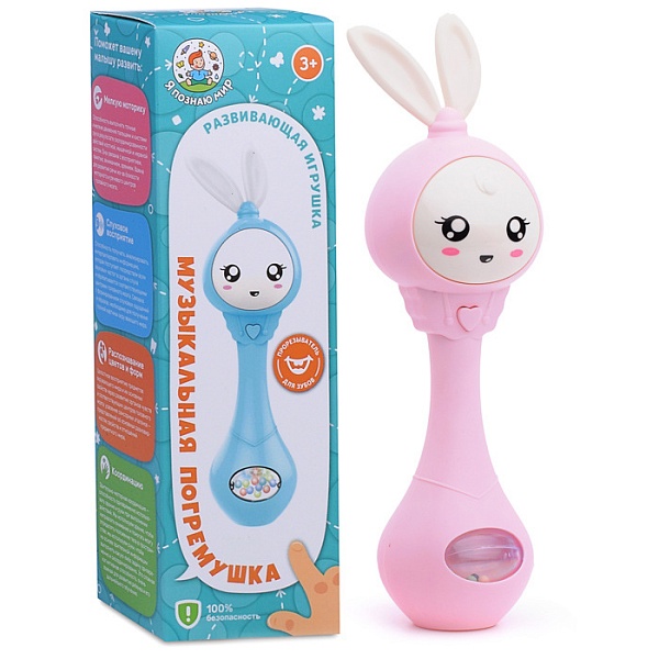 Проигрывает пять знакомых детских мелодий без слов, а также издает одиночные звуки при движении погремушки.