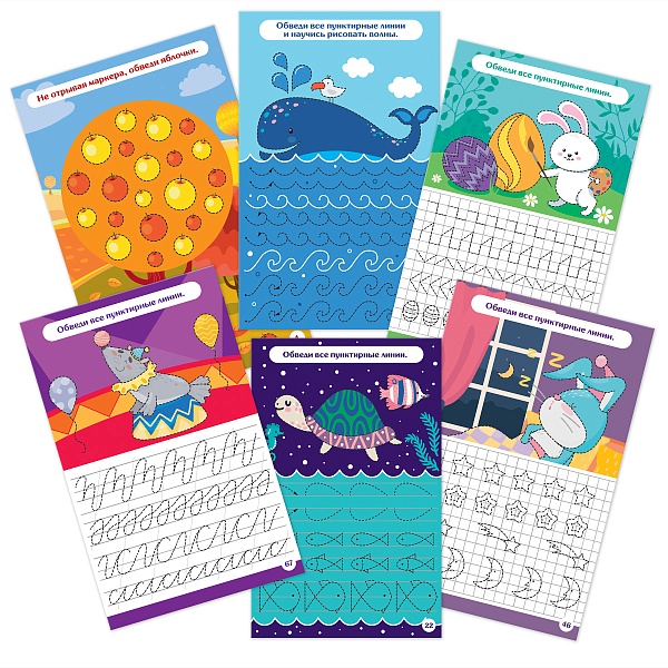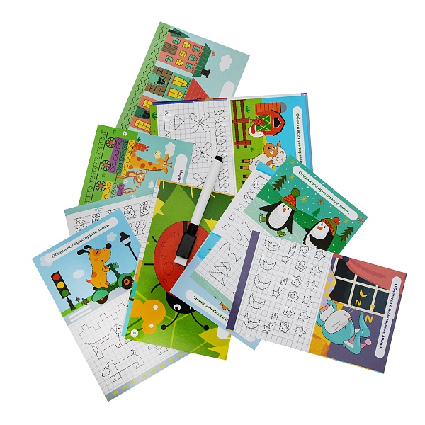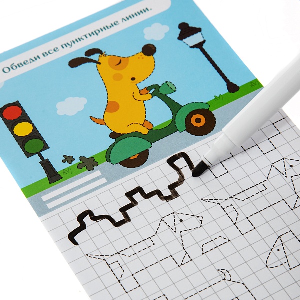 Обводите линии и выполняйте задания, создавая различные узоры и рисунки. Рисуйте по клеточкам. Переходите от простых задач к более сложным. Не бойтесь ошибаться – маркер на водной основе легко стирается обычной салфеткой.